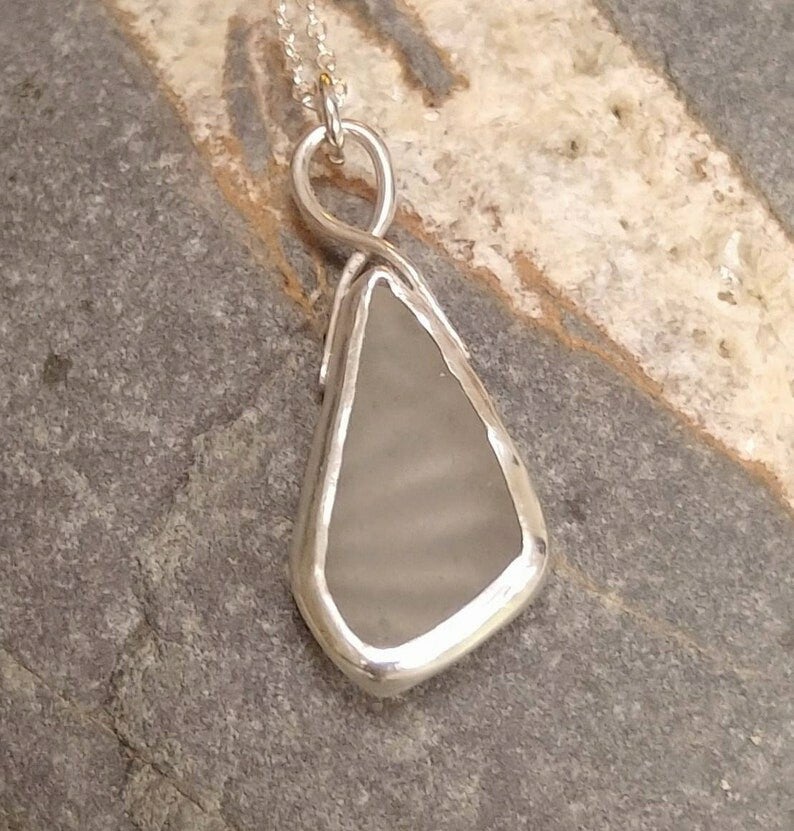 This lovely piece of shite seaglass has been set in a handcrafted Sterling silver mount which allows the light to come through the pendant. The pendant can be worn with either face showing.