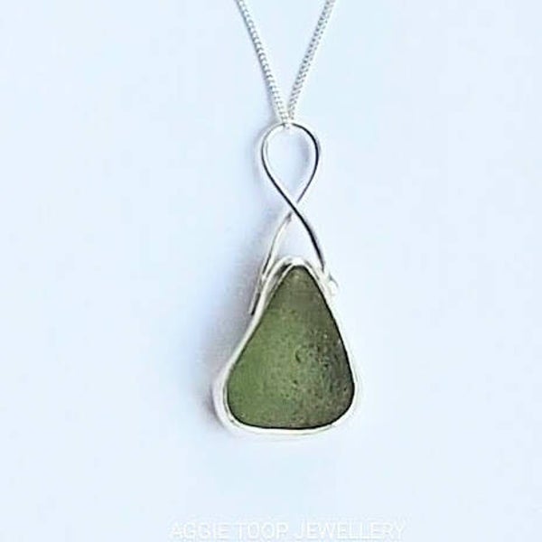 Authentic seaglass collected by myself from the Yorkshire coast. This has been set into a silver band or bezel mount and hung by cross-over wire bale.